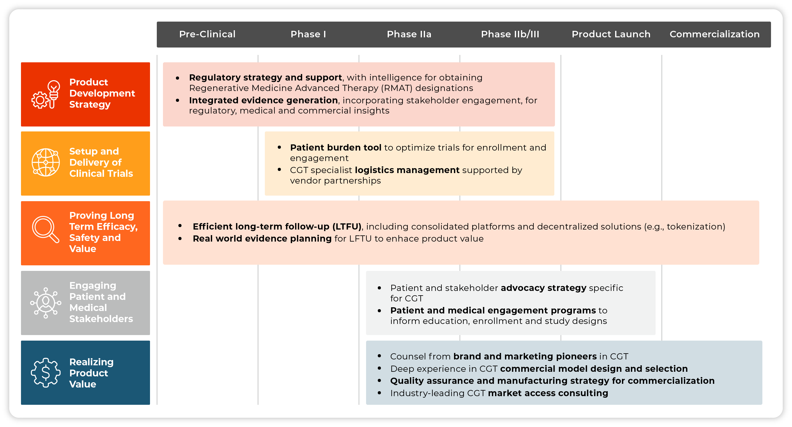 Our dedicated CGT development team allocates cell and gene experts from across our Clinical, Medical Affairs and Commercial teams to deliver complex CGT development programs.