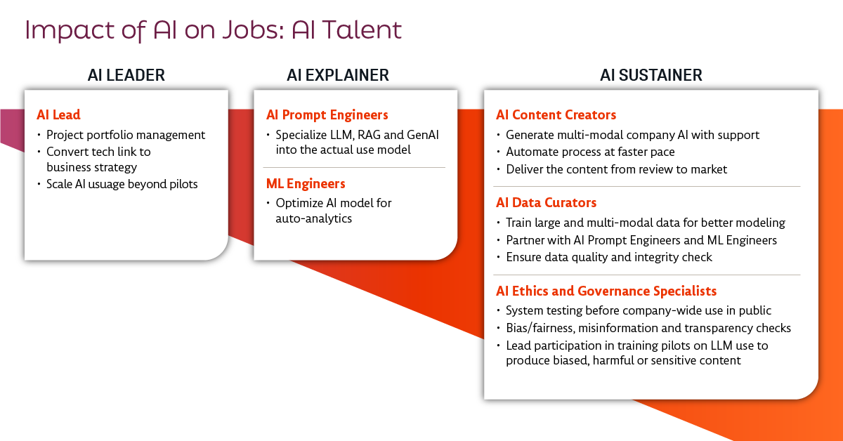 - AI ethics and governance specialists: They ensure compliance, minimize bias and mitigate reputational risk.