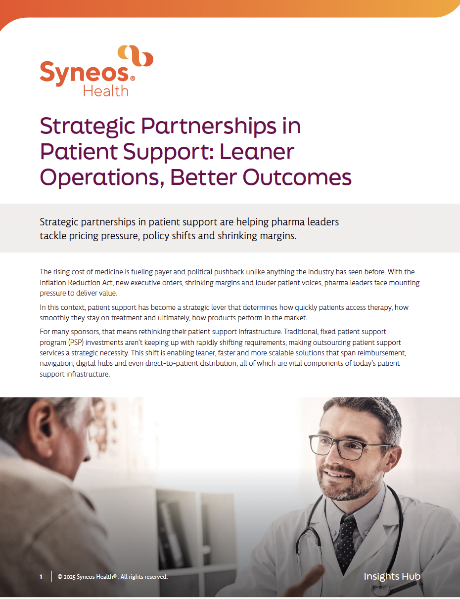 This Insights Hub perspective explores how strategic partnerships in patient support services are transforming the way sponsors deliver value. From reimbursement navigation and diagnostics to patient coaching, in-home services and direct-to-patient distribution, the right partners bring scalability, flexibility and specialized expertise to help patients start and stay on therapy.